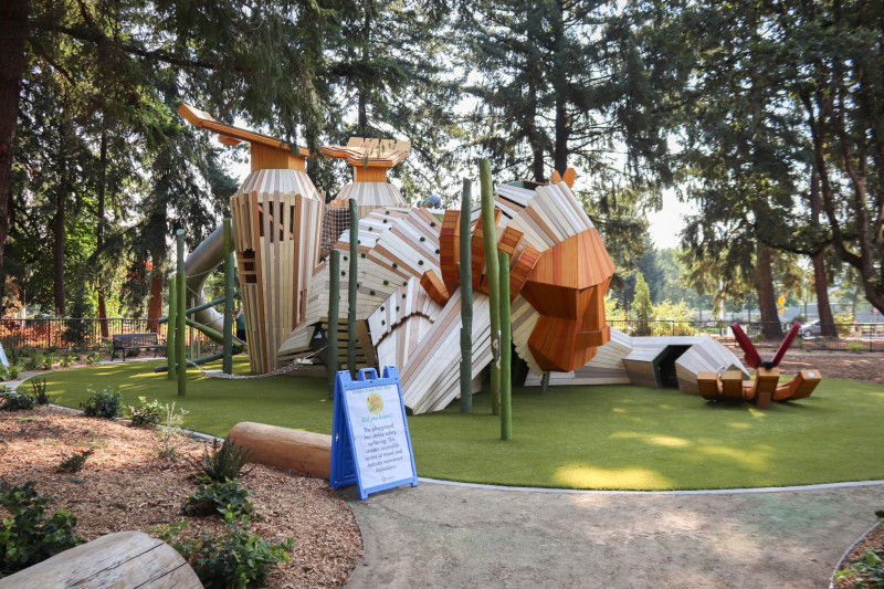 The star or the park is a custom play structure designed and fabricated by Earthscape Play Structures, which follows the City’s “Woods Gone Wild” theme.